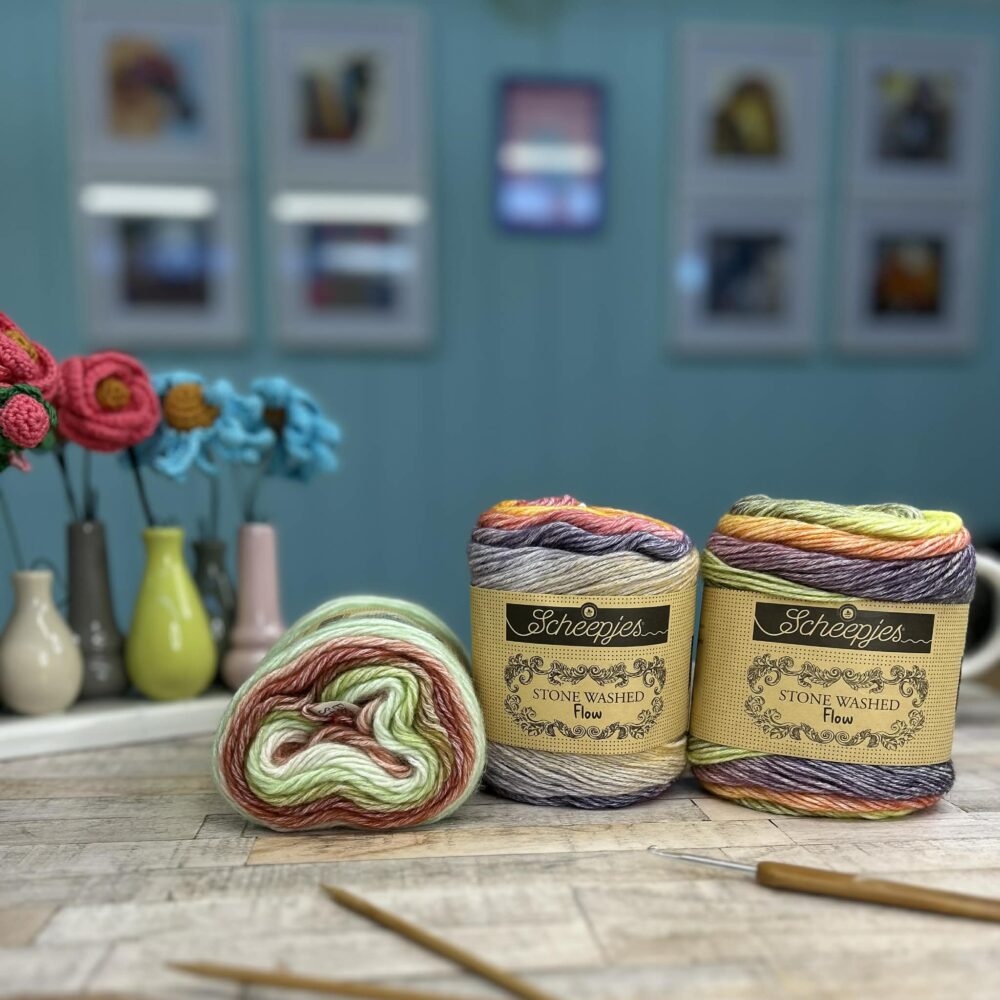 Scheepjes Stone Washed Flow is a variation on the well-known Scheepjes Stone Washed. It is the same silky-soft yarn, but with a stunning colour gradient made from existing shades from the Stone Washed collection. This allows you to create unique colour changes without having to switch yarn balls. The characteristic Stone Washed look comes from the yarn’s unique production method: colourful and fluffy acrylic fibres are blown into a net of ecru-coloured cotton. The yarn has the breathable quality of cotton but is strong and easy to care for thanks to the acrylic content. This combination makes Scheepjes Stone Washed Flow ideal for the most diverse knitting and crochet projects and also suitable for every season.